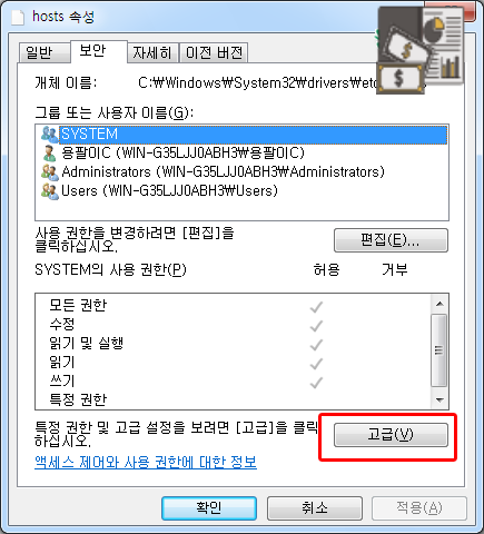 hosts 속성 상자가 열리면 보안 탭을 선택을 하시고 고급 버튼을 클릭을 하여 주세요!