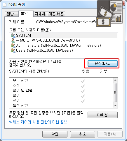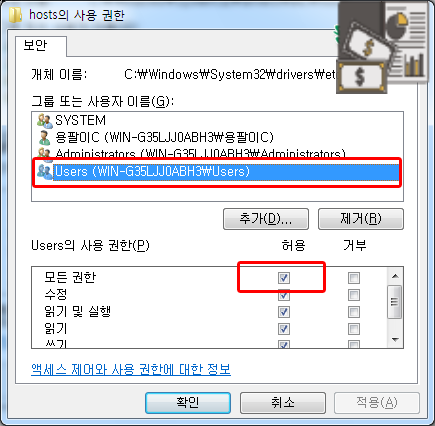 현재 사용하는 계정을 선택을 하시고 적용을 클릭을 하여주세요! 그리고 나서 모든 속성창을 닫아 주시고 나서 다시 hosts 속성 상자를 열어주세요!
